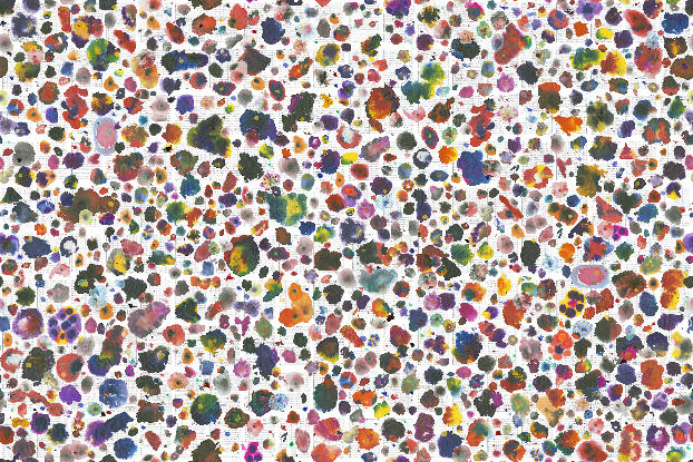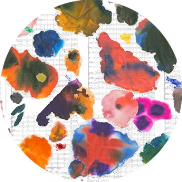 Tim Rollins and K.O.S.’s A Midsummer Night’s Dream consists of 200 pages from Felix Mendelssohn’s symphony score overlaid with more than 800 dripped, dyed, and painted flowers. Zoom in to examine details. Look up to compare the details to the full composition as a whole.